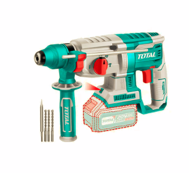 Optimiza tus proyectos con el Rotomartillo SDS Plus 2.5J Industrial Inalámbrico de Total. Ideal para perforar y cincelar concreto, mampostería y piedra, ofrece una potente energía de impacto de 2.5J. Este kit incluye tres brocas SDS Plus y un cincel, proporcionando todo lo necesario para trabajos exigentes. El sistema SDS Plus permite cambios rápidos de accesorios, garantizando eficiencia y comodidad en uso profesional e industrial.